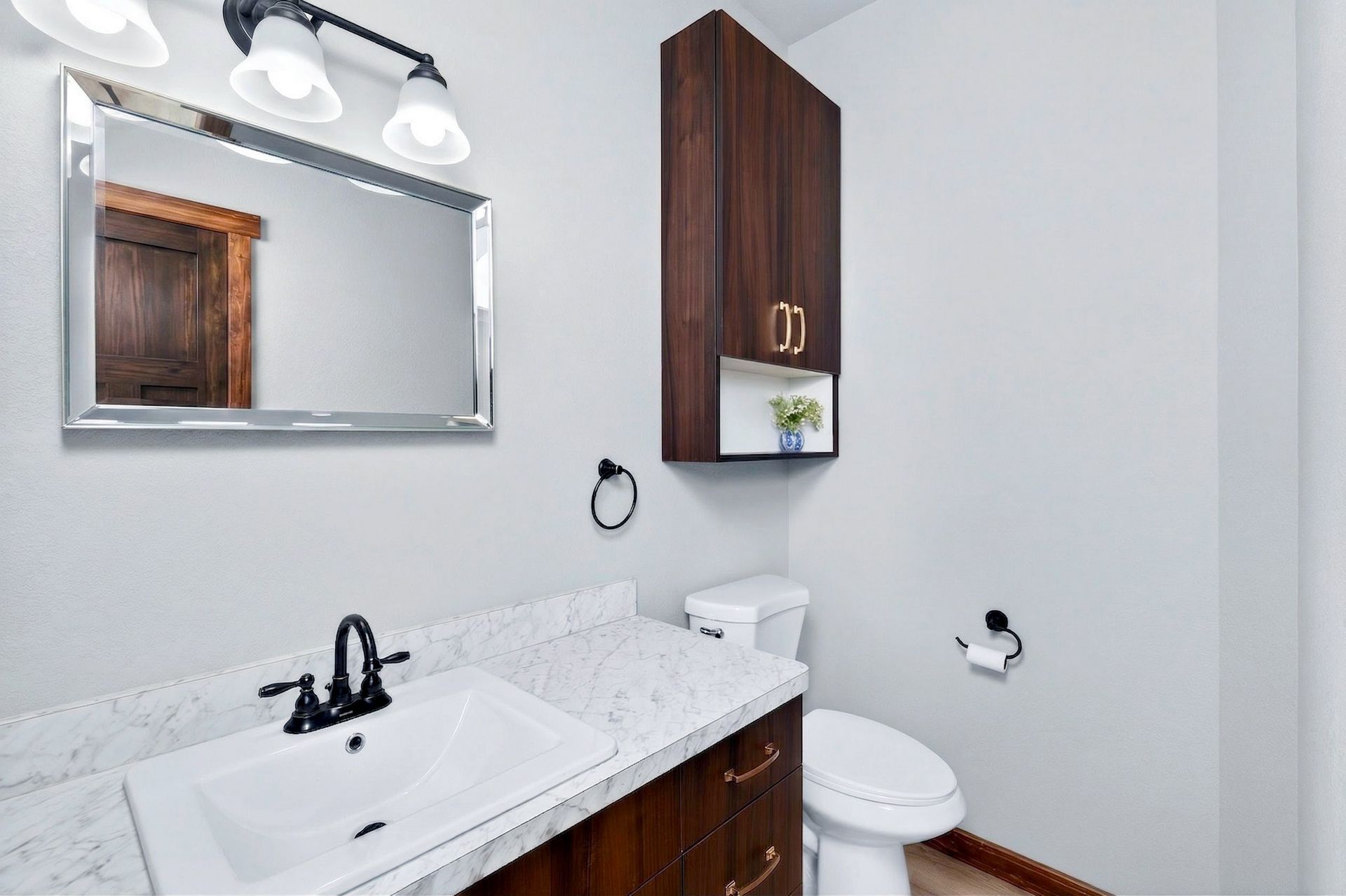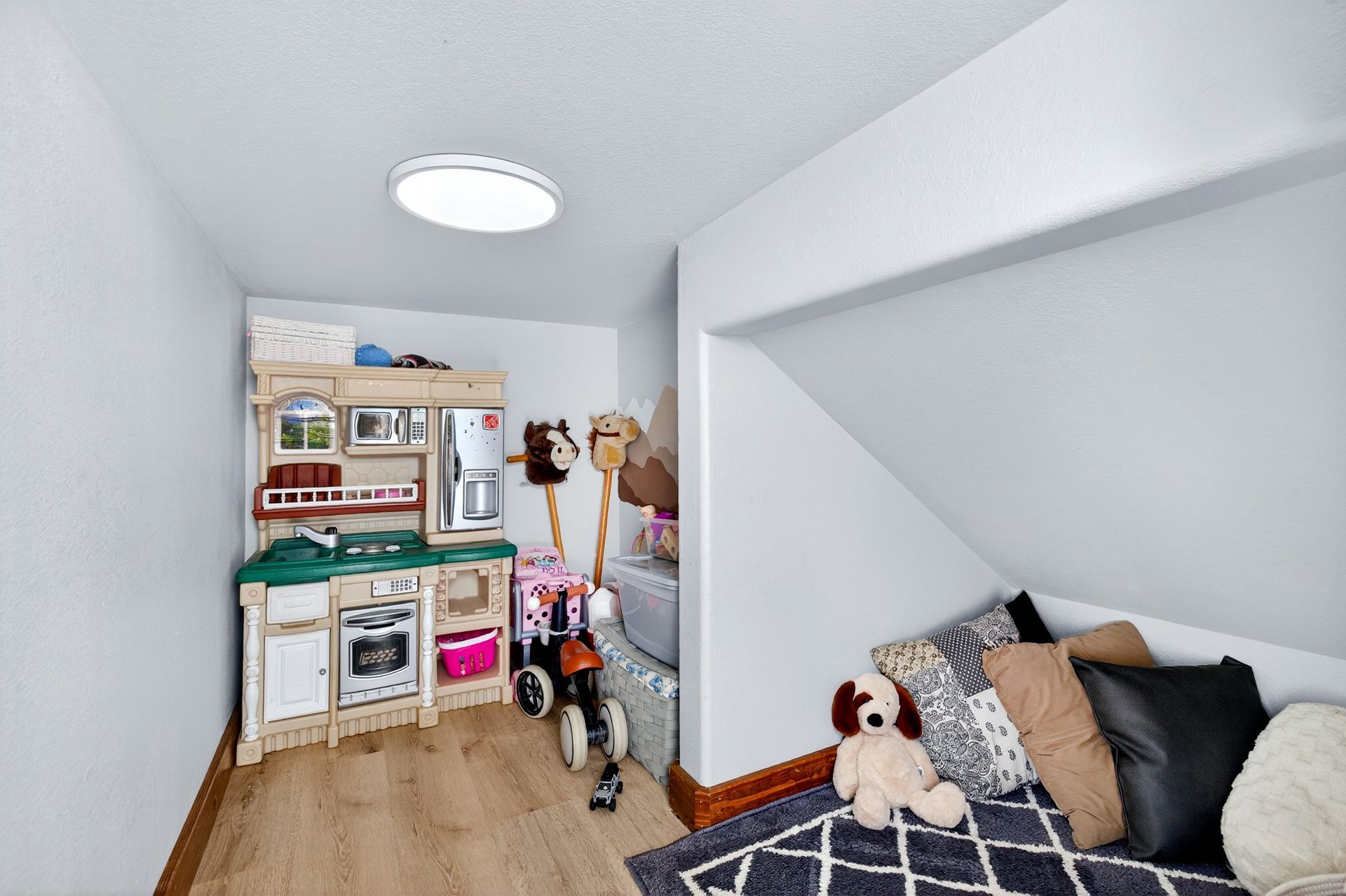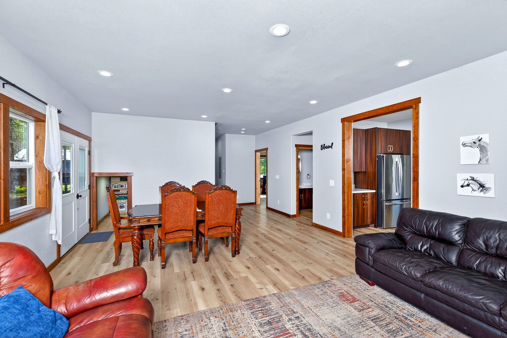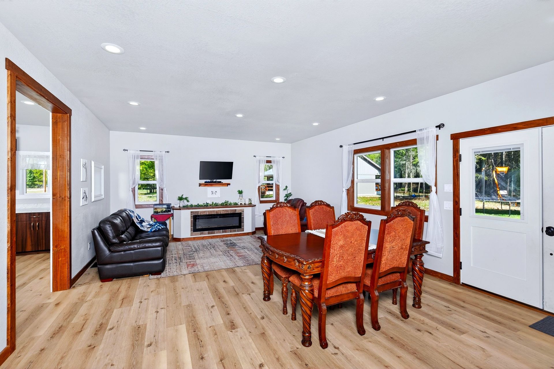 Completed in 2024, this thoughtfully designed 5BR/3.5BA home offers a flexible two-story layout with two private suites, including a main-floor primary with full ensuite bath and walk-in closet. The extra-large kitchen features soft-close custom cabinetry, farmhouse sink, pantry, and stainless appliances. Open living and dining areas offer 9' ceilings, natural light, an electric fireplace, and French doors to the backyard. A hidden playroom tucked beneath the stairs adds a whimsical touch and a fun, tucked-away space for all ages. Upstairs you'll find an additional suite with a full bath and walk-in closet, three more bedrooms, a full guest bathroom, and a sizable laundry room. Outside, the 1.14-acre setting offers a usable yard with room to play, garden, gather around the fire pit, and keep chickens, all with a peaceful country feel.